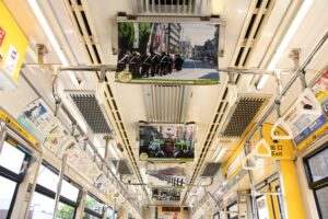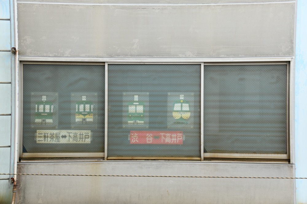 上町車庫検車庫の窓に掲出された世田谷線開通100周年記念装飾(3)/2025年5月25日 上町車庫