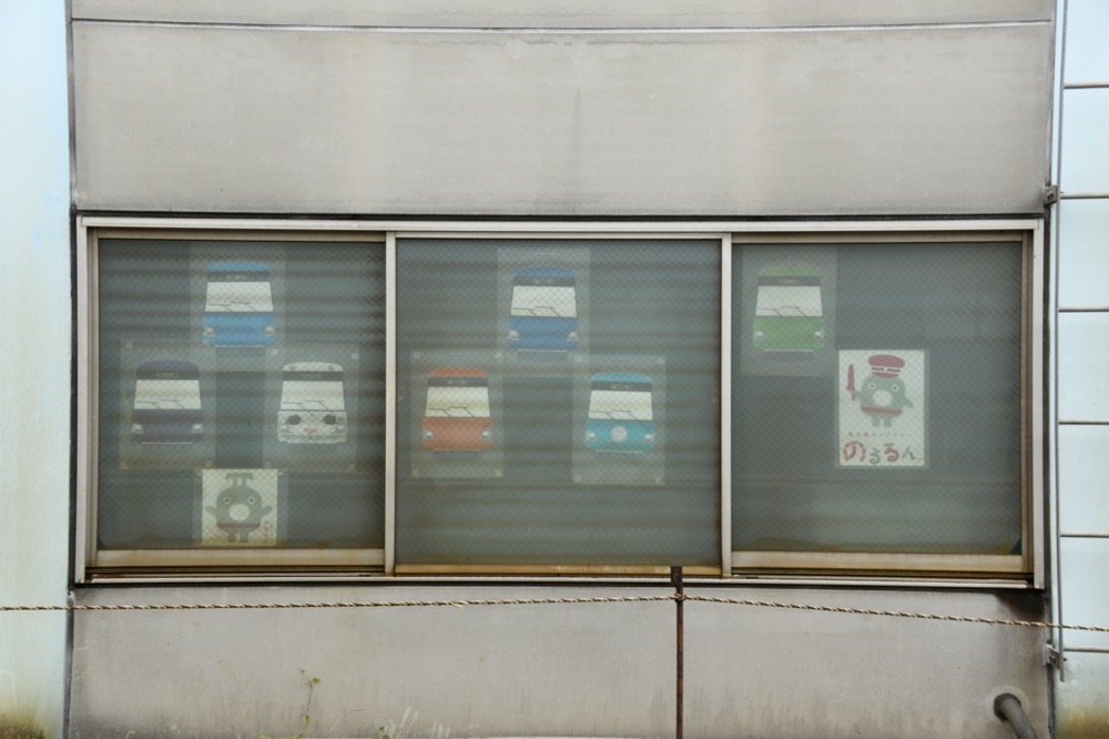 上町車庫検車庫の窓に掲出された世田谷線開通100周年記念装飾(2)/2025年5月25日 上町車庫
