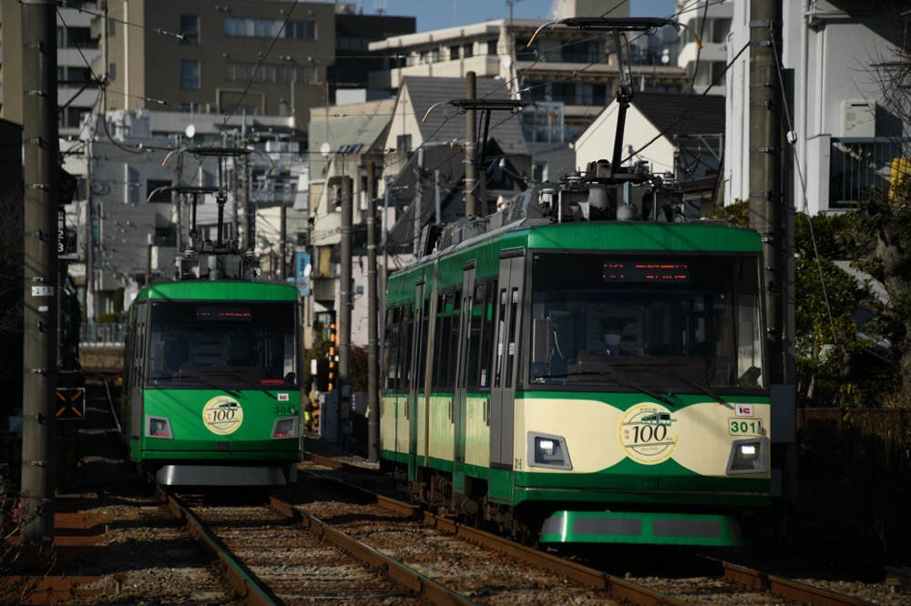 301編成と304編成「世田谷線開通100周年記念ヘッドマークステッカー」同士の並び/2026年3月12日 下高井戸〜松原間 2026年3月12日 最終更新日時 : 2026年3月28日 setagayasen 関連