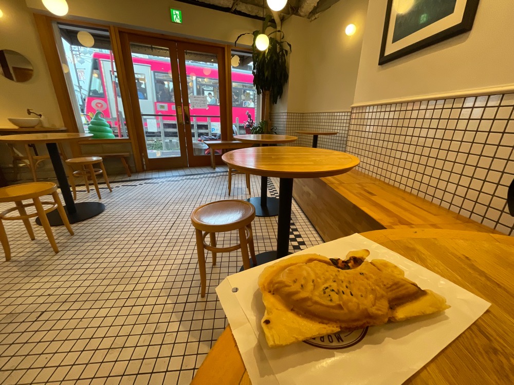 下高井戸駅前の世田谷線の踏切脇にあるたい焼き屋さん「小倉庵」下高井戸店には、イートインスペースが設けられており、すぐ目の前を行き交う世田谷線を間近に見ながらたい焼きやたこ焼きを食べることができます。外のカウンターでテイクアウトして食べ歩きしながら沿線めぐりのお供にすることもできます。
