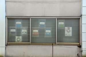 上町車庫検車庫の窓に掲出された世田谷線開通100周年記念装飾(2)/2025年5月25日 上町車庫