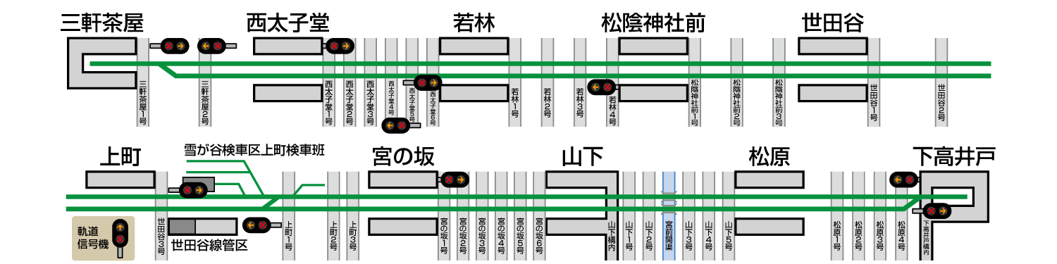| 管轄駅・乗務区 | 駅務・乗務区とも世田谷線管区(上町駅) ※世田谷線三軒茶屋駅・世田谷線下高井戸駅の管轄駅は世田谷線三軒茶屋駅 |