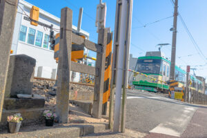 山下1号踏切道脇に建立された「馬頭観世音菩薩」と301編成/2026年1月14日 山下〜松原間